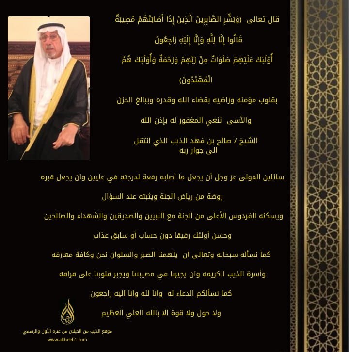 سيصلى عليه ان شاء الله بعد صلاة الجمعة ٢٨ رمضان في جامع عمر بن عبد العزيز (الورثان) والدفن وتلقى التعازي في مقبرة الجبيل وسيكون عزاء الرجال ابتداء من يوم الجمعة في قسم الرجال بمنزل ابنه محمود الذيب ابو صالح بشارع المعرفة بحي الخليج من الساعه التاسعه مساء حتى الساعه الحادية عشر مساء لمدة ثلاث ايام