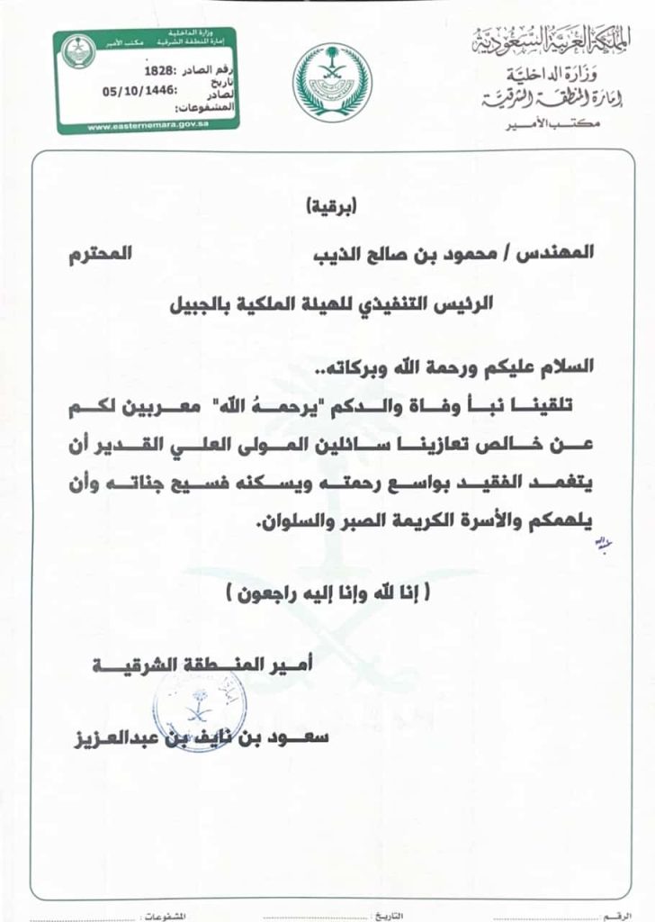 محافظ الجبيل يقدم واجب العزاء للمهندس محمود الذيب الرئيس التنفيذي للهيئة الملكية للجبيل بوفاة والده